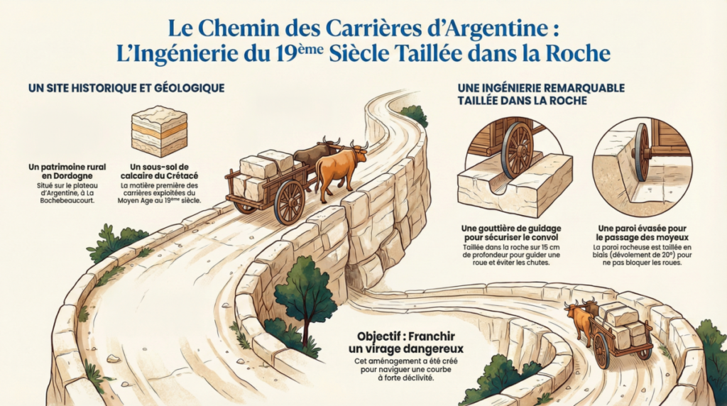 Cet article présente le chemin des carrières du plateau d’Argentine, situé en Dordogne au sein de la commune de La Rochebeaucourt et Argentine. Ce sentier rural, autrefois essentiel pour le débardage de blocs de pierre, présente des aménagements techniques remarquables sculptés directement dans le calcaire. On y observe notamment une gouttière de guidage et une paroi biseautée conçues pour sécuriser le passage des lourdes charrettes à bœufs dans les zones escarpées. L’étude s’appuie sur des cartes géologiques et cadastrales ainsi que sur des photographies pour préserver la mémoire de ce patrimoine industriel oublié. Ce site témoigne de l’ingéniosité des maîtres carriers du XIXe siècle face aux contraintes topographiques de la région.