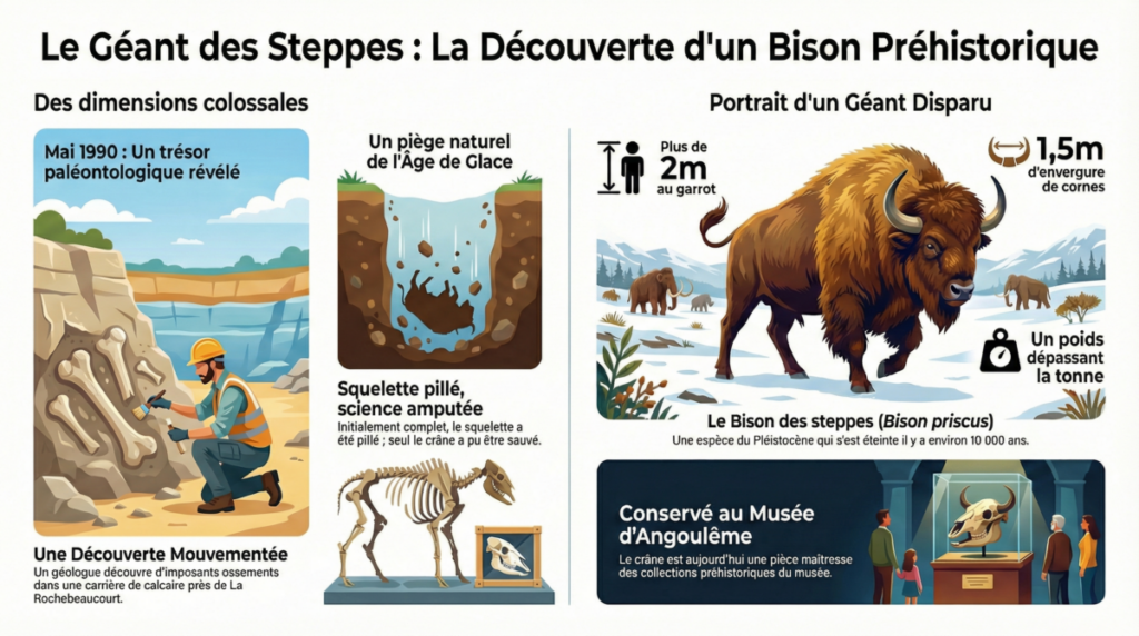 Cet article relate la découverte paléontologique majeure d’un Bison priscus, ou bison des steppes, survenue en mai 1990 dans une carrière à la frontière de la Charente et de la Dordogne. Ce spécimen mâle du Pléistocène a été retrouvé dans un aven naturel, une cavité ayant servi de piège pour la faune ancienne. Bien qu’une grande partie du squelette ait malheureusement disparu suite à un pillage archéologique, le crâne a pu être sauvé grâce à une intervention scientifique rigoureuse. Les sources détaillent les méthodes de dégagement complexes, utilisant des résines et des moules, nécessaires pour préserver cette pièce fragile. Aujourd’hui, ces vestiges sont conservés au Musée d’Angoulême, où ils témoignent de la biodiversité glaciaire européenne. L’ensemble souligne l’importance de la protection du patrimoine face aux dégradations humaines lors de trouvailles fortuites.