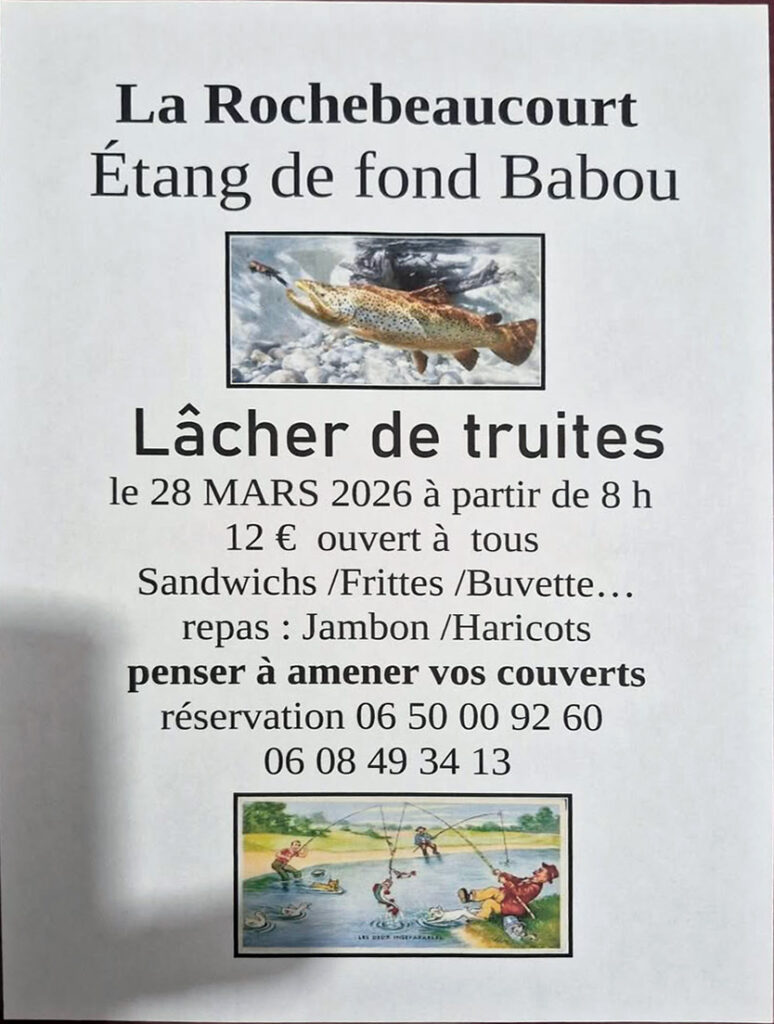 Le lâcher de truites est toujours un moment très attendu. Il offre aux participants l’occasion de partager une expérience simple et authentique, au contact de la nature. Dès le début de la matinée, les pêcheurs pourront s’installer autour de l’étang pour tenter leur chance dans une ambiance chaleureuse et accessible.